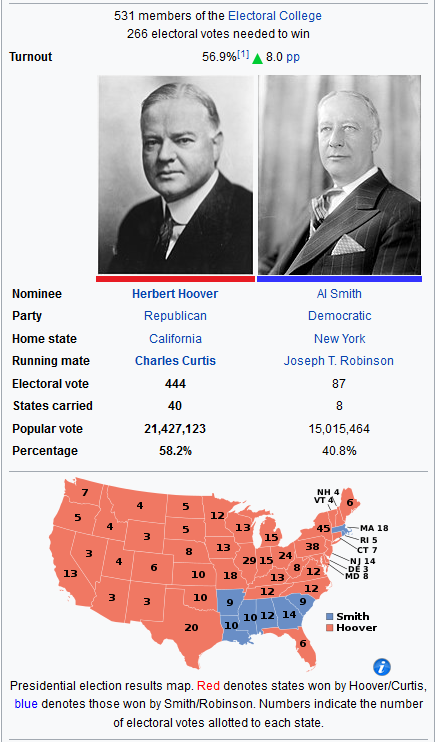 Okay, that's pretty much the same territory Hoover, won, minus North Carolina. When we examine the electoral map again (with another Wikipedia page-grab, see left), we see that Eisenhower also lost Kentucky and West Virginia, but pretty much lost every other southern state, in almost exactly the same pattern Hoover had.